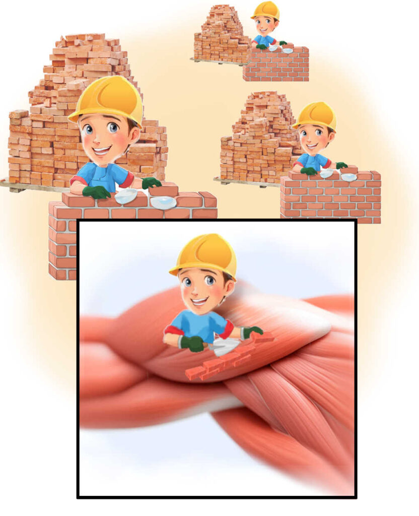 Każdy z nich chwyta za cegły(białko) których jest pod dostatkiem i muruje coraz większe ściany- czyli rośnie mięsień.