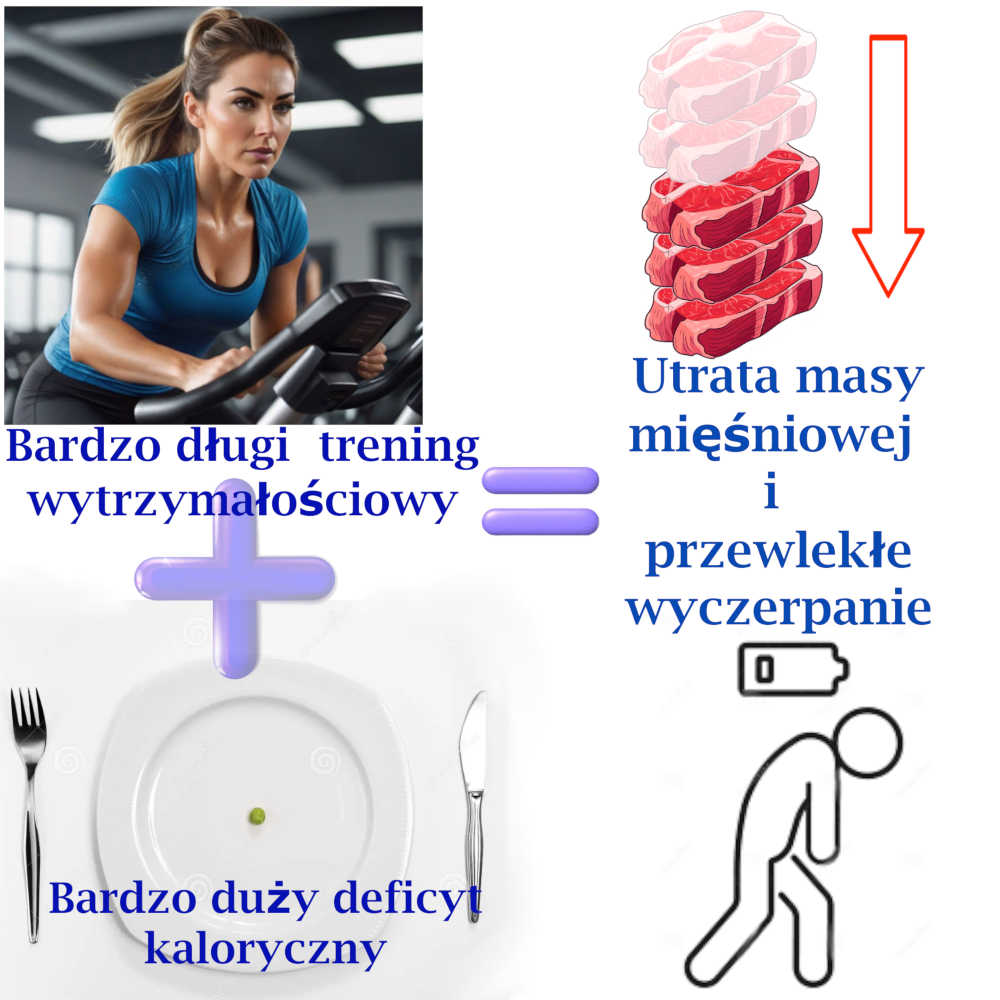 Trening cardio przy jednoczesnym deficycie kalorycznym może przynieść utratę wagi lecz  nieuchronnie prowadzi też do utraty cennej masy mięśniowej. Deficyt kaloryczny to stan alarmowy dla organizmu który niechętnie pozbywa się zapasów energii(tłuszczu) zgromadzonych w ciele, dlatego szuka innego nieużywanego balastu którego może się pozbyć w tym trudnym czasie. Trening cardio jest treningiem wytrzymałościowym który angażuje przede wszystkim wolnokurczliwe włókna mięśniowe. Włókna mięśniowe szybkokurczliwe,czyli  te których używamy do krótkiej ale bardzo intensywnej pracy, są pomijane w takim treningu. W sytuacji niedożywienia  oraz  braku  aktywności szybkokurczliwych włókien mięśniowych, organizm „stwierdza”,że włókna te są zbędnym balastem który „kradnie” jedynie składniki odżywcze ciału będącemu już i tak w deficycie energetycznym. W efekcie takiej strategii żywieniowo-treningowej osoba odchudzająca się traci wagę  ale wraz z tłuszczem traci też dużo cennej masy mięśniowej. Po takiej przemianie sylwetka wygląda niekorzystnie, brak jej kształtu, twardości , jędrności, ciało jest słabe. Co gorsze , taki sposób pozbywania się tkanki tłuszczowej grozi osobie odchudzającej się  tzw.efektem jojo .