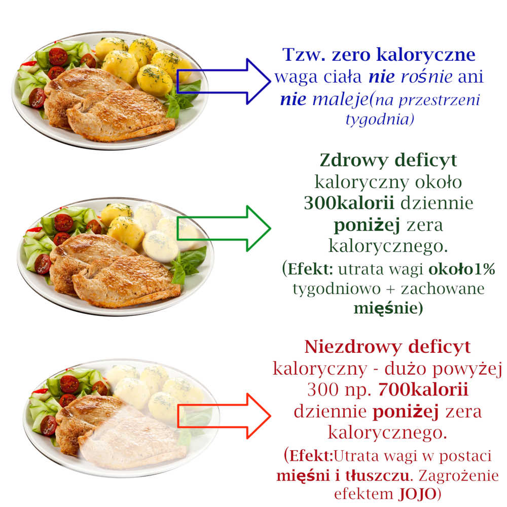 Zazwyczaj zdrowy deficyt kaloryczny wynosi  około 300 kalorii poniżej tzw. zera kalorycznego(czyli takiej podaży kalorii która nie powoduje tycia ani chudnięcia), ale może być zupełnie inny. Taki deficyt kaloryczny jest bezpieczny i skuteczny, pozwalając na stopniową utratę wagi bez narażania zdrowia i poziomu energii. Istotnym jest też spożycie białka na poziomie około 1.6g-2g białka na1kg wagi ciała co pomaga zapobiec nadmiernej utracie tkanki mięśniowej podczas redukcji masy ciała.