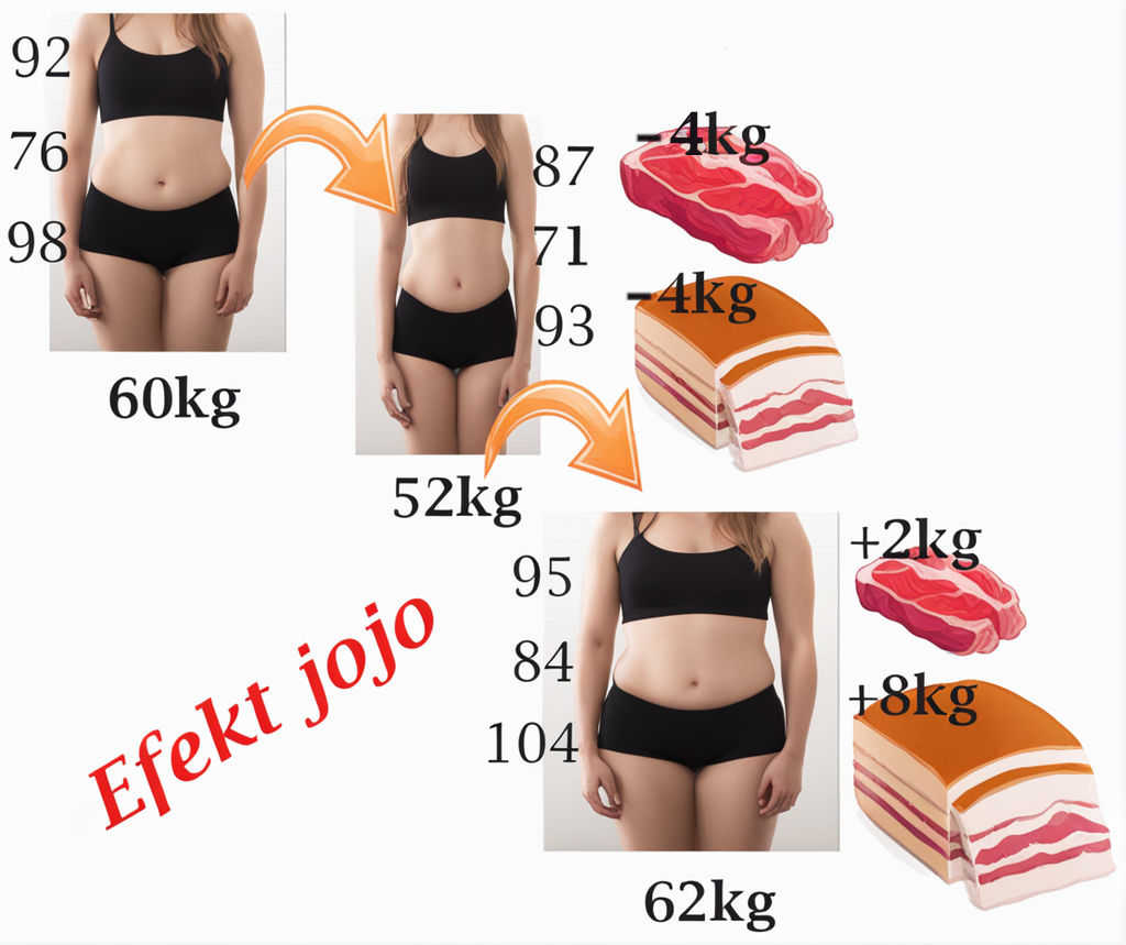 Powrót do nawyków żywieniowych sprzed przemiany  sprawi  to, że utracona w toku niewłaściwego odchudzania masa mięśniowa nie odbuduje się tak szybko jak  tkanka tłuszczowa która bardzo łatwo powróci ,a nawet przewyższy stan sprzed odchudzania. W efekcie, osoba którą „dopadnie” efekt jojo ma mniej mięśni niż przed przemianą, a często jeszcze więcej tkanki tłuszczowej .  Taka sylwetka wygląda jeszcze gorzej niż wcześniej, a ciało poprzez mniejszą masę mięśniową traci na sprawności.