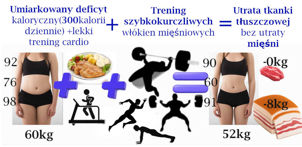 Pozbycie się nadmiaru tkanki tłuszczowej wymaga deficytu kalorycznego. Ciało, aby funkcjonować potrzebuje energii której dostarczamy mu z pożywieniem. Przewlekły niedostatek energii z pożywienia karze ciału sięgać po jej zapasy – nagromadzoną tkankę tłuszczową. Jeśli deficyt kaloryczny utrzymywany jest dostatecznie długo to utrata tkanki tłuszczowej staje się wyraźnie widoczna. Jak dotąd mechanizm ten jest pozytywny z punktu widzenia kogoś kto się odchudza gdyż tkanki tej ubywa. Mniej korzystny jest drugi mechanizm gdzie ciało szuka  przy okazji zbędnego balastu którego może się pozbyć aby nie obciążać ciała w tej alarmowej sytuacji jaką jest niedobór pożywienia. Mogą to być mięśnie jak w sytuacji przesadnego treningu cardio o którym była mowa wcześniej.  I tutaj trening aktywujący szybkokurczliwe włókna mięśniowe przychodzi na ratunek! Jeśli odpowiedni trening zaangażuje te włókna „przeznaczone do zadań specjalnych” wówczas ciało „widzi”  , że są one potrzebne i często używane dlatego  nie traktuje ich jako zbędnego balastu którego trzeba się pozbyć. Trening stymulujący szybkokurczliwe włókna mięsniowe pomaga więc zachować mięśnie podczas okresu głodzenia w którym ciało czerpie zasoby energii z tkanki tłuszczowej.