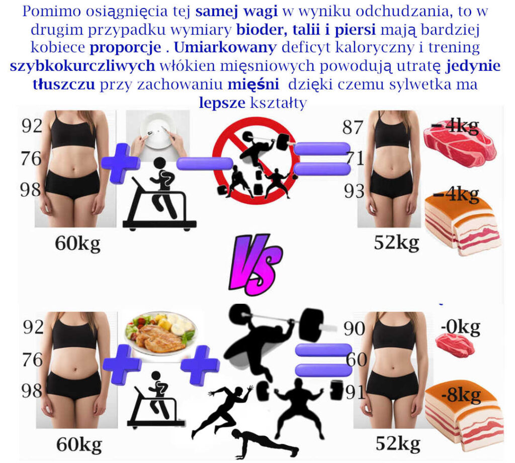 Sylwetka wygląda o wiele lepiej gdy traci się 10kg jedynie tkanki tłuszczowej w porównaniu do sylwetki gdzie również traci się 10kg z czego 5kg to tkanka tłuszczowa a pozostałe 5kg to mięśnie. W drugim przypadku nie następuje rekompozycja ciała gdyż proporcje tkanki tłuszczowej do mięśniowej pozostają takie same jak przed przemianą. Ciało wygląda tak samo jak przed przemianą , a zauważalne jest jedynie to,że stało się mniejszą wersją tego sprzed odchudzania. Dodatkowo łatwo o efekt jojo czyli szybki powrót , a nawet przekroczenie wagi sprzed przemiany z jednocześnie gorszymi proporcjami tkanki tłuszczowej do tkanki mięśniowej. A trzeba pamiętać o tym, że utrata mięśni to obok gorszych walorów estetycznych, także fizycznie słabsze ciało które bardziej męczy się w zadaniach dnia codziennego.