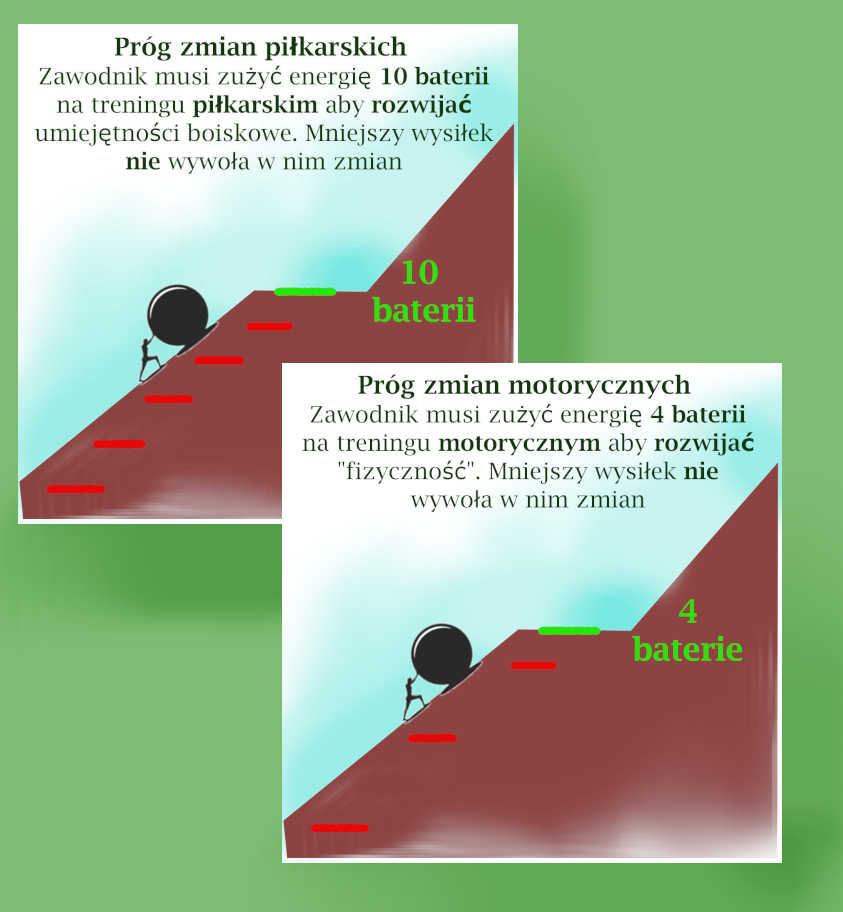 Aby lepiej uzmysłowić sobie limit energii jaką dysponuje każdy z nas, wyobraź sobie zawodnika piłki nożnej jako zaawansowaną zabawkę na baterie, której działanie opiera się na wymiennych akumulatorkach. Załóżmy, że ma on do dyspozycji szesnaście baterii, które zapewniają energię na cały dzień intensywnych treningów i codziennych obowiązków. Każdej nocy, baterie te są wyjmowane i ładowane w specjalnej ładowarce – każda godzina snu naładowuje dwie baterie, więc potrzeba ośmiu godzin snu, aby w pełni naładować wszystkie szesnaście baterii. Załóżmy też, że aby rozwijać umiejętności piłkarskie zawodnik musi poświęcić na treningi piłkarskie taką ilość energii która zużywa 10 baterii dziennie. Jest to minimalny próg który zapewnia rozwój i jeśli zużyje ich mniej np. tylko 9, to nie będzie rozwijał tych umiejętności. Aby nastąpił rozwój „fizyczności” za którą odpowiada trening motoryczny, zawodnik musi zużyć energię co najmniej 4 baterii(próg rozwoju fizyczności). Zawodnik, nie żyje tylko treningiem i inne aktywności dnia codziennego(stres, nauka czy praca) również zużywają cenną energię baterii.